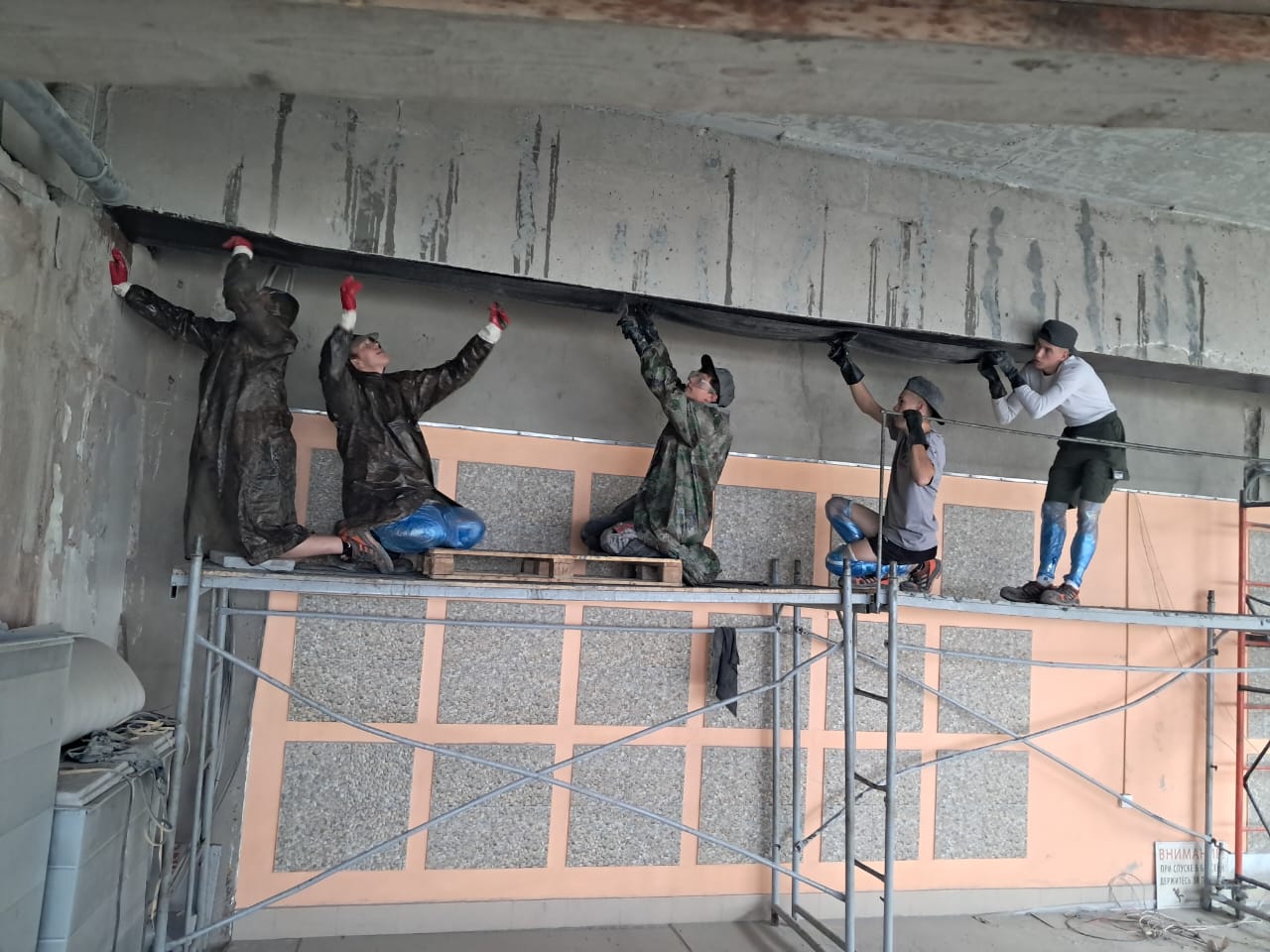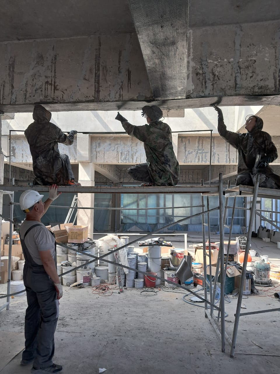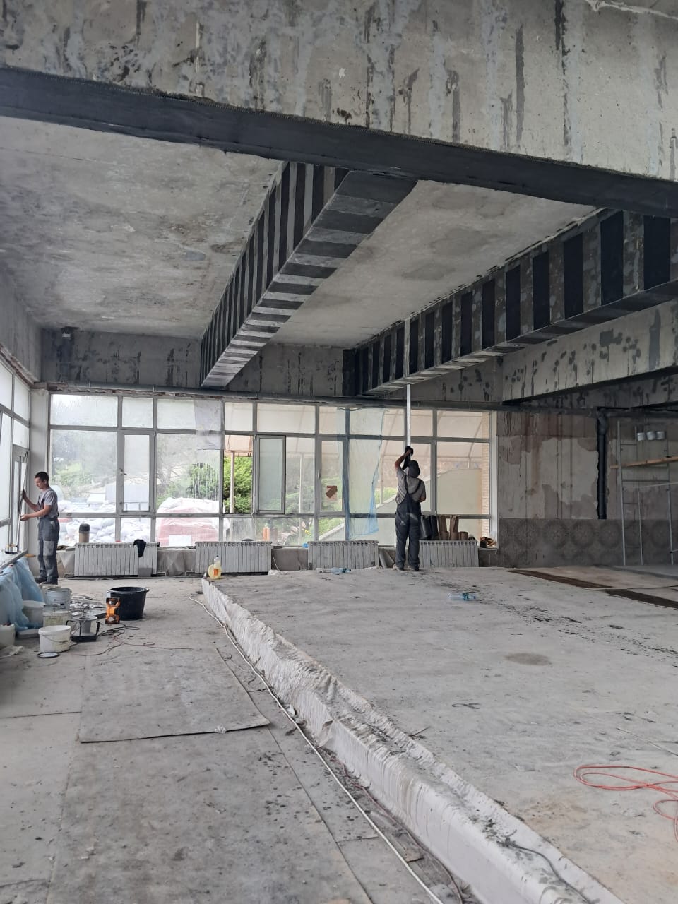 Демонтаж разрушенного защитного слоя бетона на плите перекрытия и зачистка арматуры от ржавчины. Покрытие очищенной арматуры антикорозионным составом. Усиление несущей способности ригельных балок перекрытия методом иньектирования эпоксидных смол в трещины, гидроизоляция бассейнов с тёплой морской водой, усиление колон и балок композитными материалами и углеволокном.