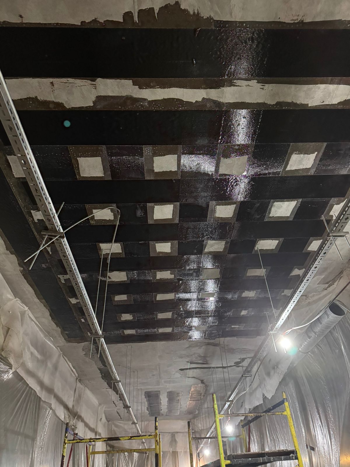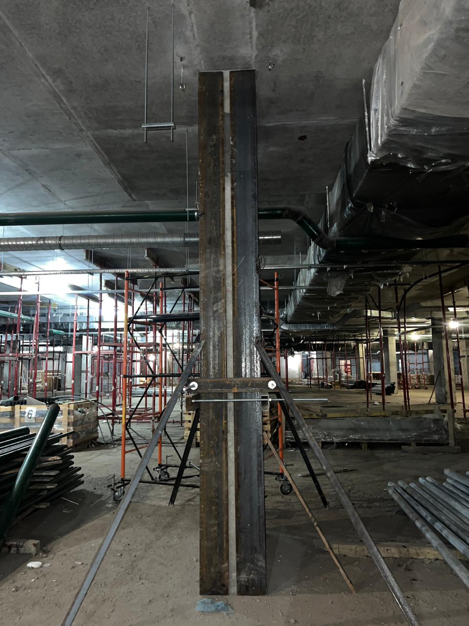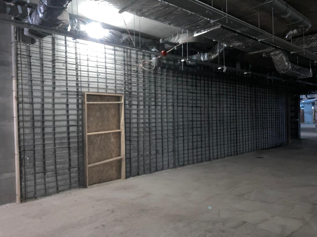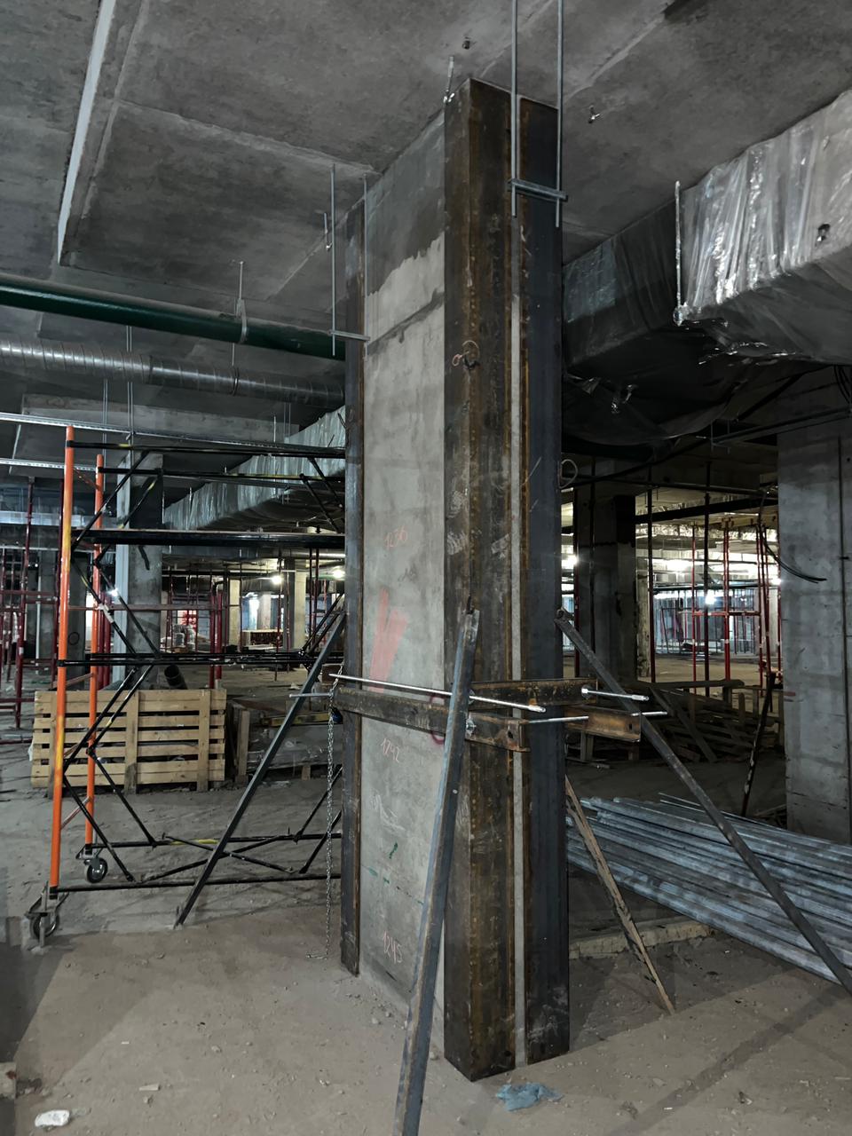 Выполненная работа: Монтаж железных обойм пилонов, установка вертикальных уголков, раскройка металла. Усиление плиты перекрытия углеволокном с последующем нанесение огнезащитного покрытия. ⁠Усиление пилонов металлическими обоймами. ⁠Усиление стен при помощи увеличения торкретирования.