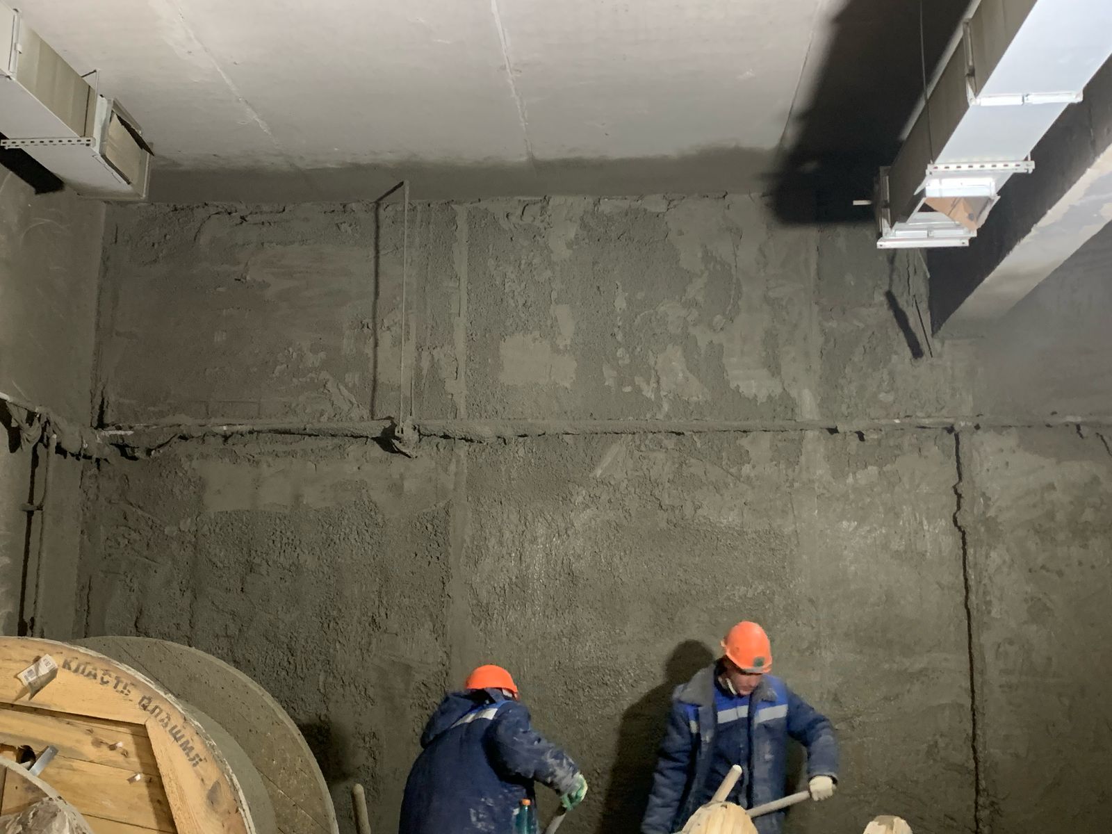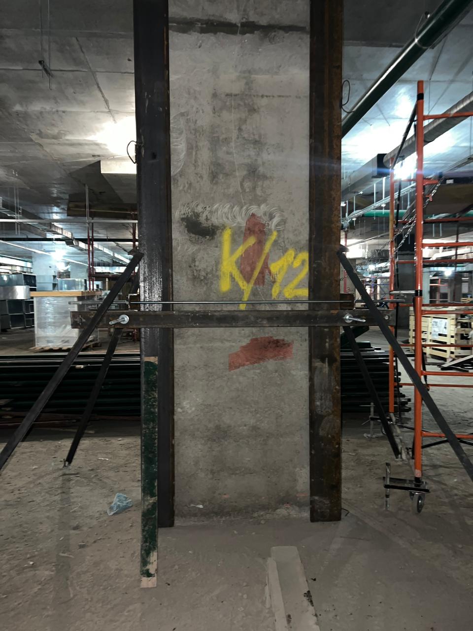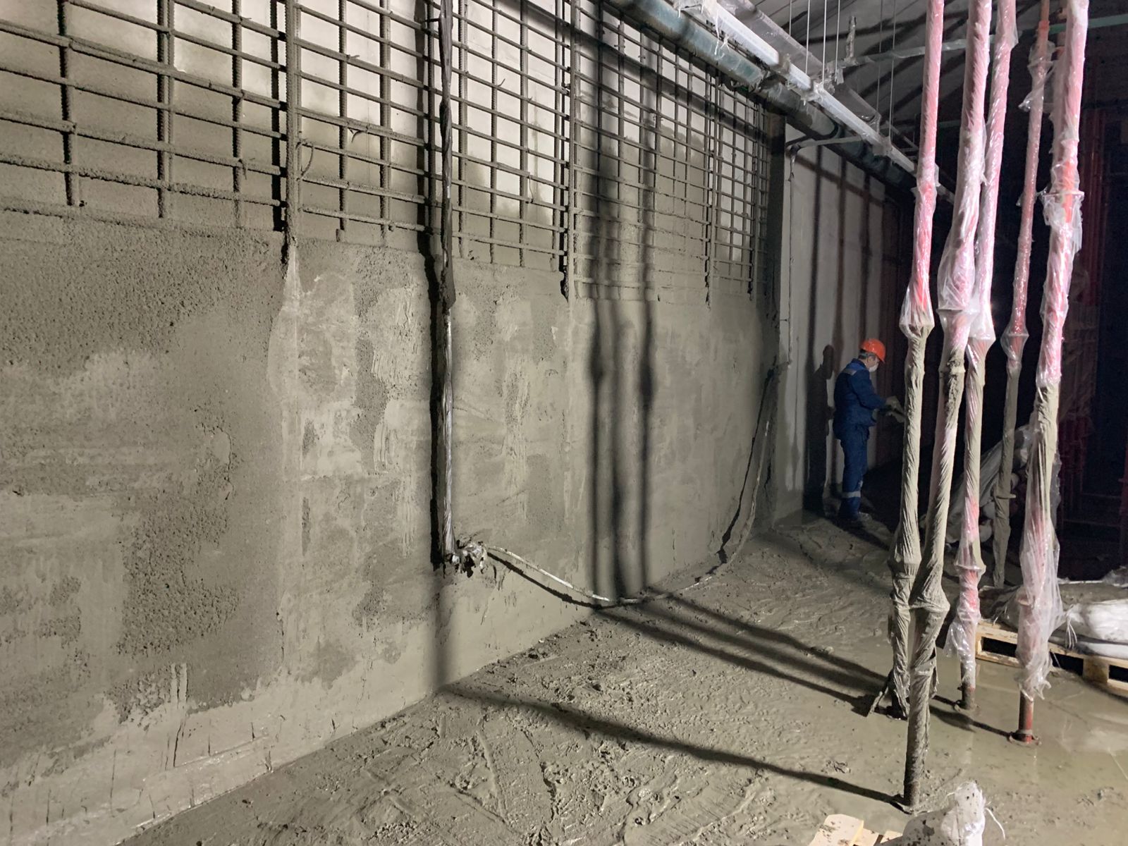 Выполненная работа: Монтаж железных обойм пилонов, установка вертикальных уголков, раскройка металла. Усиление плиты перекрытия углеволокном с последующем нанесение огнезащитного покрытия. ⁠Усиление пилонов металлическими обоймами. ⁠Усиление стен при помощи увеличения торкретирования.